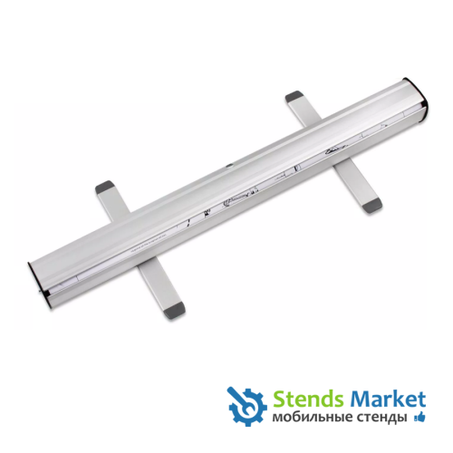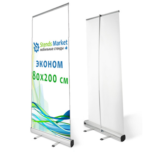 Недорогой ролл-ап стенд, конструкция которого максимально оптимизирована для снижения стоимости. При этом он отлично выглядит, устойчив и функционален. Для крепления полотна используется скотч 3М.