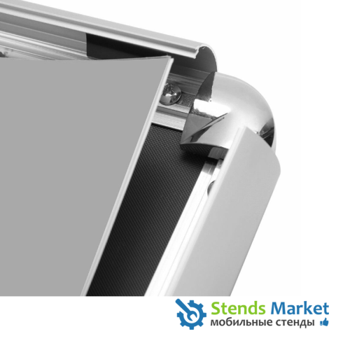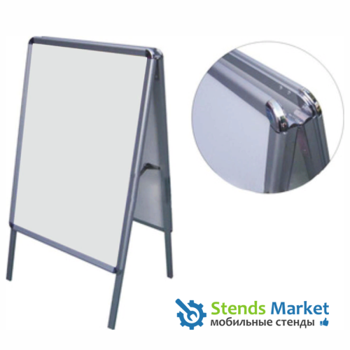Рама штендера изготовлена из алюминиевого клик-профиля 25 мм, ноги алюминиевые, задняя стенка рамки - металл. Штендер укомплектован антибликовым пластиком для защиты постера.