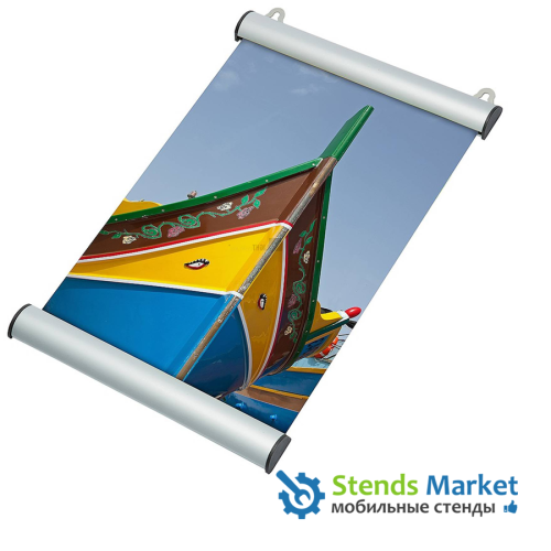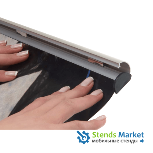 Комплект зажимов состоит из верхней и нижней планки. Верхняя планка оснащена двумя креплениями, позволяющими прикрепить ее на стене, к потолку или верхней части проемов. Нижняя планка работает как утяжелитель, натягивая постер и предотвращая скручивание его нижнего края.